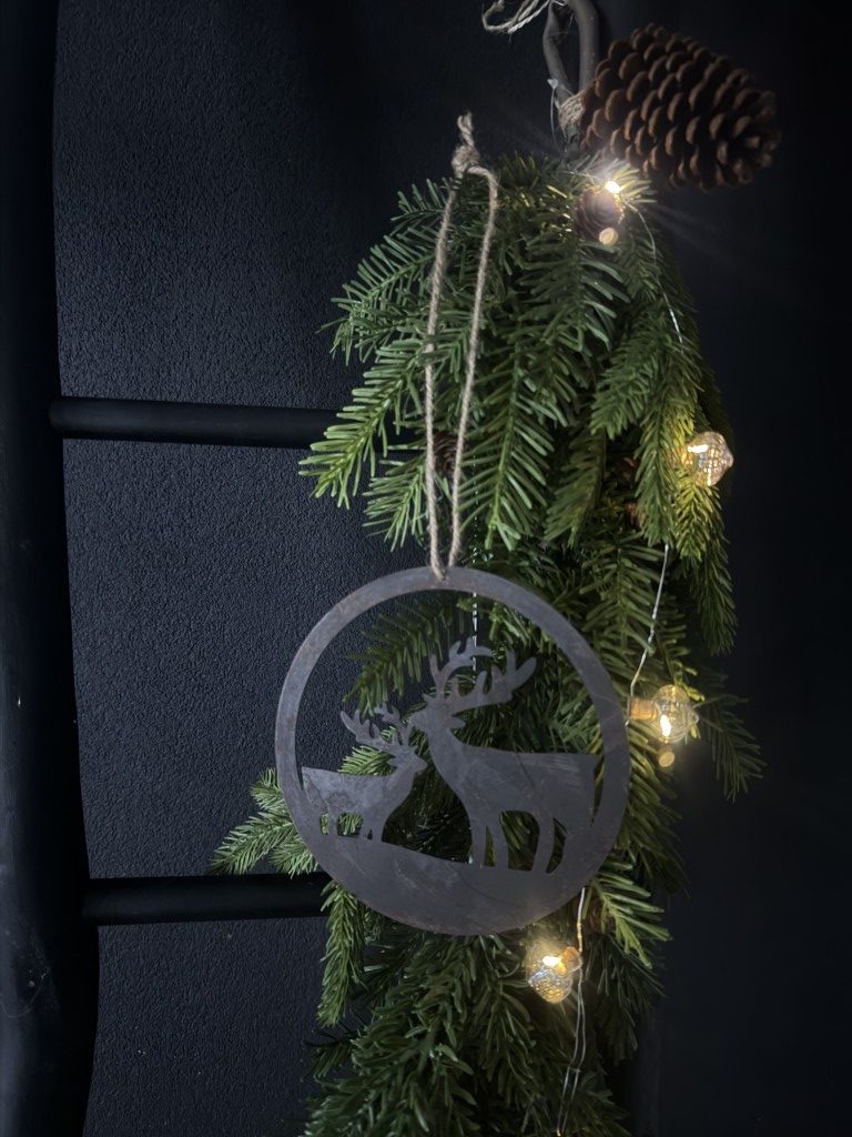 Eenvoudige, roestkleurige kersthanger in de vorm van een kerstbal. De eenvoud en het natuurlijke roestige uiterlijk maken deze hanger perfect voor een shabby, landelijk of stoer interieur.