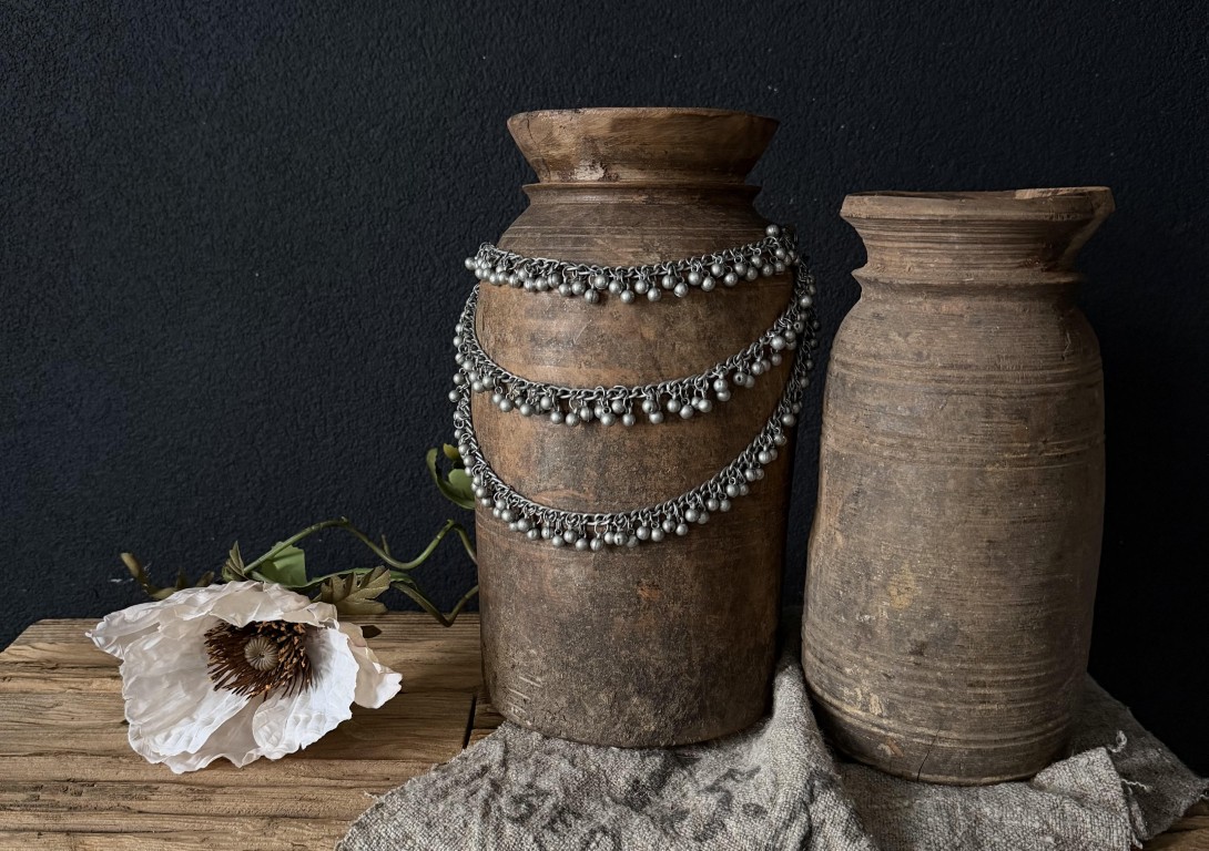 In een stoere, sobere, landelijke, vintage of bohemian inrichting kunnen oude houten Nepalese potten niet ontbreken. Deze oude Nepalese pot is voorzien van een prachtige ketting met muntjes en geeft de pot een extra speciale touch!